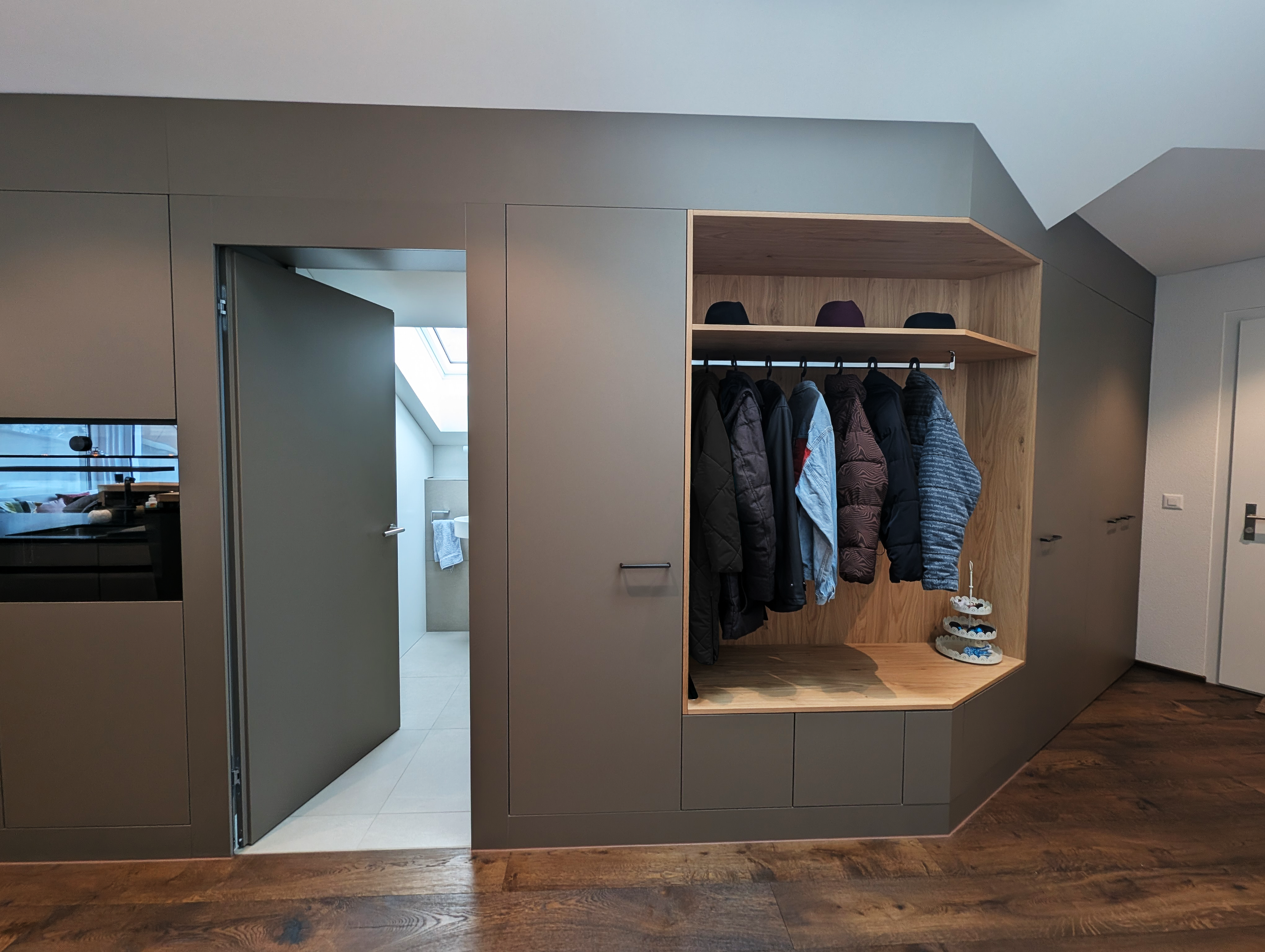 Das wirklich Spezielle an dieser Küche ist jedoch die fliessende Verbindung zur Garderobe. Statt eines harten Schnitts zwischen Kochen und Ankommen entsteht ein durchgängiges Möbelbild. Die Fronten laufen weiter, die Linien bleiben sauber und der Raum wirkt wie aus einem Guss.