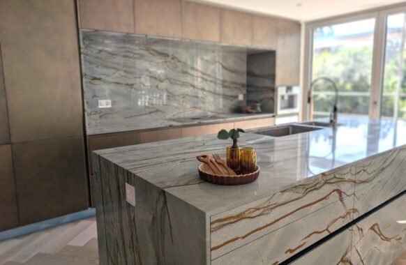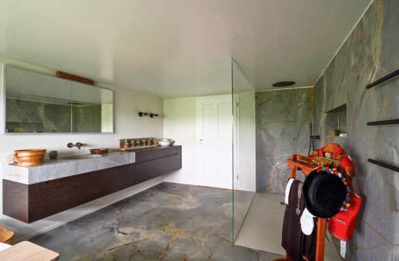 In einem charmanten Appenzeller Ferienhaus durften wir ein besonderes Projekt realisieren: Gleich drei Badezimmer wurden mit dem Naturstein Quarzite Blue Sky in satinierter Ausführung ausgestattet.